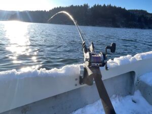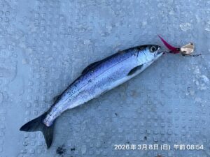 魚探の反応は禁猟区ブイ沿いで水深10メートル前後にヒメマスの反応、流し直し時にヒメマス1尾ヒット。仕掛けはヒメトロ用、オモリ50号、ライン15メートル出し、船速1kt/h、ルアー夜光貝3cm+ピンクFoxTailフライ直結、アジ針2本チラシ。