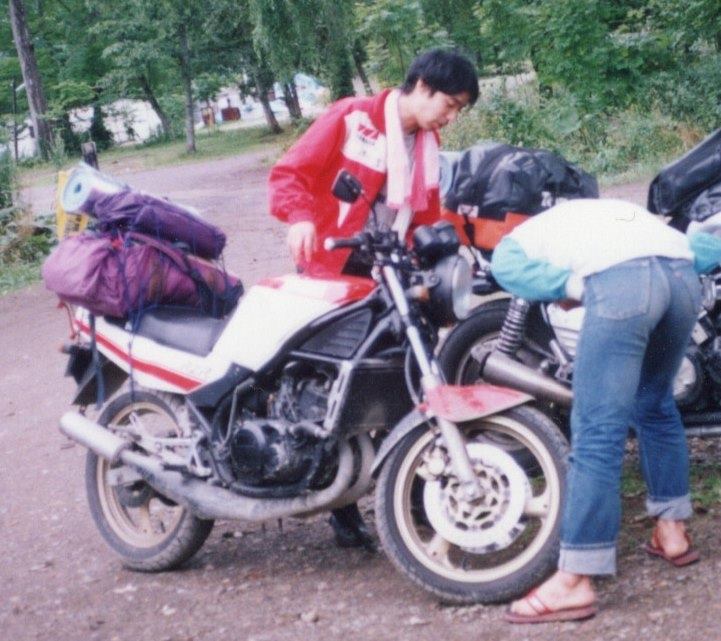 小樽に向かう国道5号線は、ペースメーカーのパトカーの後をゆっくりと、法定速度で走っていく。短気な人間には辛い走行だが、周りの流れに合わせて、安全速度で走る事に何の抵抗も感じない。バイク屋のオッサンの顔がチラつく。 小樽のフェリー埠頭で休憩する。坂井君と下田君は、相変わらずはしゃいでいる。筆者は、記念撮影用のアンカーによじ登っている。「馬鹿と煙は高いところに登りたがる」のは本当らしい。 「小樽の運河」という言葉の響きは、何となくロマンチックなムードを思い起こさせるが、現実には、ただの「運河」であった。やはり、こうしたものは、その時の背景や同行者など、様々な物理的及び心理的要因が、ロマンチックなムードを演出させるのだろう。理想と現実のギャップを知ったショックで、その日の昼食の味はさっぱりわからなかった。 小樽からは、道道3号線を定山渓温泉へ向かう。快適な峠道だ。坂井君と筆者のペースが次第に上がってくる。しかし、こんな所で転ぶようなまねをするほどまぬけではない。三浦さんは峠道になると、おっかなびっくりだ。そのほうが良いのかもしれない。意外と、誠君がエキサイトして、坂井君と筆者を後ろからしきりにつっつき回している。けっこう熱い走りだ。佐藤さんはマイペースだ。 定山渓温泉を過ぎ、中山峠の登りにさしかかる。雪国のためカーブのRはとても大きく、車体をほとんど傾けずに行ける。快適だ。 喜茂別の生協で、本日の夕食のおかずの買い出しをする。みなの意見(とは言っても、主に坂井君と下田君)から、本日のメニューは「エビチリ」に決定した。佐藤さんはちょっぴり不服そうだった。 国道276号線を支湖へ向かう。高度が上がるに従って、肌寒くなってくる。美笛峠付近にさしかかると、再び原始の自然が顔を出してきた。しかし、原始の自然と思っていても、そこは既に人間の手が入っている。ヒグマやキタキツネの生息する森に、突如としてアスファルトの道が出現し、騒音と窒素酸化物をまき散らす車やバイクが群れを為してやってくるようになってしまったのだ。ヒグマやキタキツネは、たまったものではないだろう。こんな所にも人間のわがままが生み出した罪を見てしまったようだ。 支湖の国設美笛キャンプ場付近は未舗装路だった。キャンプ場入り口で三浦さんを待つ。看板を見ながらみなで話しているうちに、「もうちょっと先じゃない?」ということになってしまった。ここから、5キロメートル(筆者は6往復、計30キロ)のダート走行が始まった。 先頭を走る坂井君は、何とV-MAXをDTのようにふりまわしながら、土煙をあげて突っ走っていく。後からRZが追う。まるでラリーのようだ。この運転は、車種からは想像できない、アホすぎる。 突然、前方を走るV-MAXがバランスをくずしだした。深いジャリに突っ込んでいる。次の瞬間、坂井君の巨体が宙を舞った。どうやら、アセッて前タイヤに荷重をかけてしまったようだ。 坂井君は、300キロ近くあるV-MAXの下敷きになっている。坂井君を横目に見ながら、慎重にRZを停止させ、彼のもとにかけつける。間違いなく骨折しているなと思いながら、V-MAXから彼を引きずり出す。しかし、思いのほか、元気そうだ。RZを止めるのに、けっこう空走してしまったので、彼は「見捨てられたのかと思っちゃったよぉ」と明るくのたまっている。体の各部をチェックするが、異常はなさそうだ。V-MAXも、ほぼ無傷に近い。フカフカのジャリが、クッションの役を果たしてくれたのだろう。ラッキーすぎる・・・・・・。 しばらく進んでから、三浦さんを待つが、とんと来そうな気配は感じられない。様子を見に、筆者がもどることになった。他のメンバーは、ダートで思うように走らない鉄のカタマリを横目に、途方に暮れている。 三浦さんはキャンプ場の入り口で待っていた。三浦さんは、残りのメンバーの行方を心配していた。筆者は、もう一度彼らの所まで戻っていく。しかし、林道の終点まで行っても、彼らはいなかった。そのことを三浦さんに伝えるため、また戻っていく。三浦さんから、「もうちょっと見てこい」と指令が下る。 林道をのたのた走っていると、向こうから自転車を押している金髪の女性が近づいてきた。その場のノリで英語で声をかける。彼女は、”Oh,jeans jackets! アッチノホーデミタネェ”と日本語混じりの英語で明るく親切に答えてくれた。林道を抜け、舗装路を進んで行くと、次第に山道にさしかかってきた。恵庭岳を迂回する道だったのだが、地図を持たない筆者は、何となく心細くなって、薄暗くなった林道を再び引き返していった。 二人で呆然と彼らが来るのを待つ。30分が過ぎ、1時間が過ぎようとする頃、V-MAX、ニンジャ、CBRの爆音がこだましててきた。彼らは、ダートを走るのを避けて支笏湖を一周してきたのであった。 キャンプ場で、設営を開始する。誠君は、今度はどうやら一人で設営できたようだ。みな、思い思いの